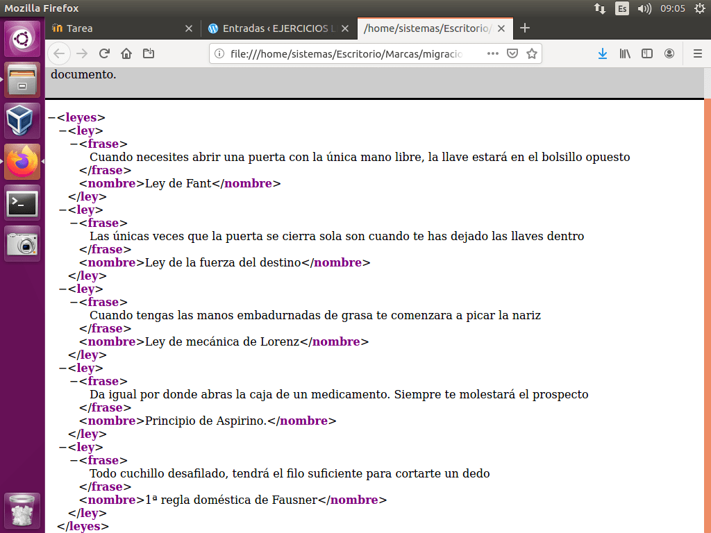 Además, podemos deducir que se trata de una tabla, donde «frase» y «nombre» serían los encabezados de la tabla, y sus respectivos campos serían las frases de abajo, separados por punto y coma. La tabla podría llamarse «leyes».