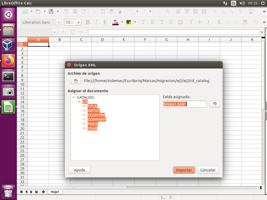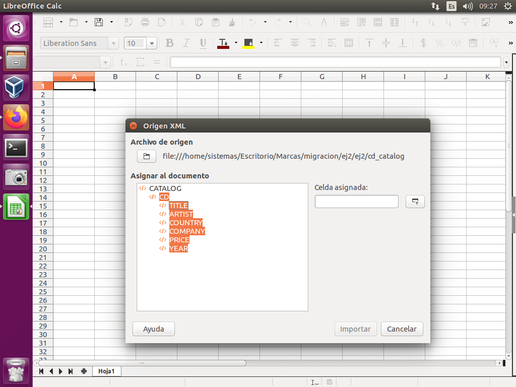 Tomo el siguiente fichero XML cd_catalog.xml que contiene un catálogo de cds. El objetivo del ejercicio es pasar dicha información a una hoja de cálculo.