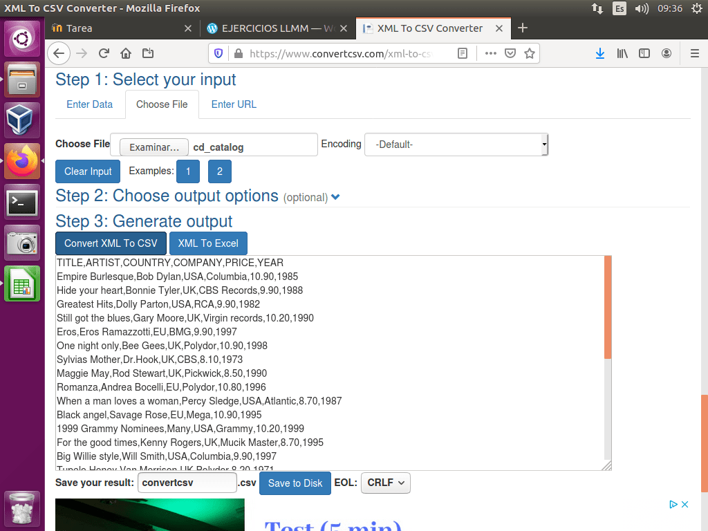 Como vemos, hemos conseguido pegar en contenido de la forma deseada a través de esta opción. Sin embargo, también podemos hacerlo a través de un conversor online (https://www.convertcsv.com/xml-to-csv.htm):